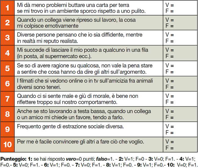 Come devi comportarti in azienda? Come devi relazionarti con i colleghi e affrontare le mansioni che ti vengono assegnate per battere un raccomandato? Gli psicologi hanno elaborato il seguente test di autovalutazione, basandosi anche sugli studi del ricercatore americano Louis A. Penner in merito alla “prosocialità” e al comportamento cooperativo (Prosocial personality battery PSB di Penner L.A. 2002). Il test ha il solo scopo di farci riflettere su alcuni dei nostri modi di vivere nell’ambiente di lavoro. Come si fa: Rispondi alle domande e assegna il punteggio sottoindicato, poi tira le somme. Un punteggio da 6 in su è un buon risultato. Al di sotto, occorre rivedere il proprio rapporto con gli altri (e anche quello con se stessi).